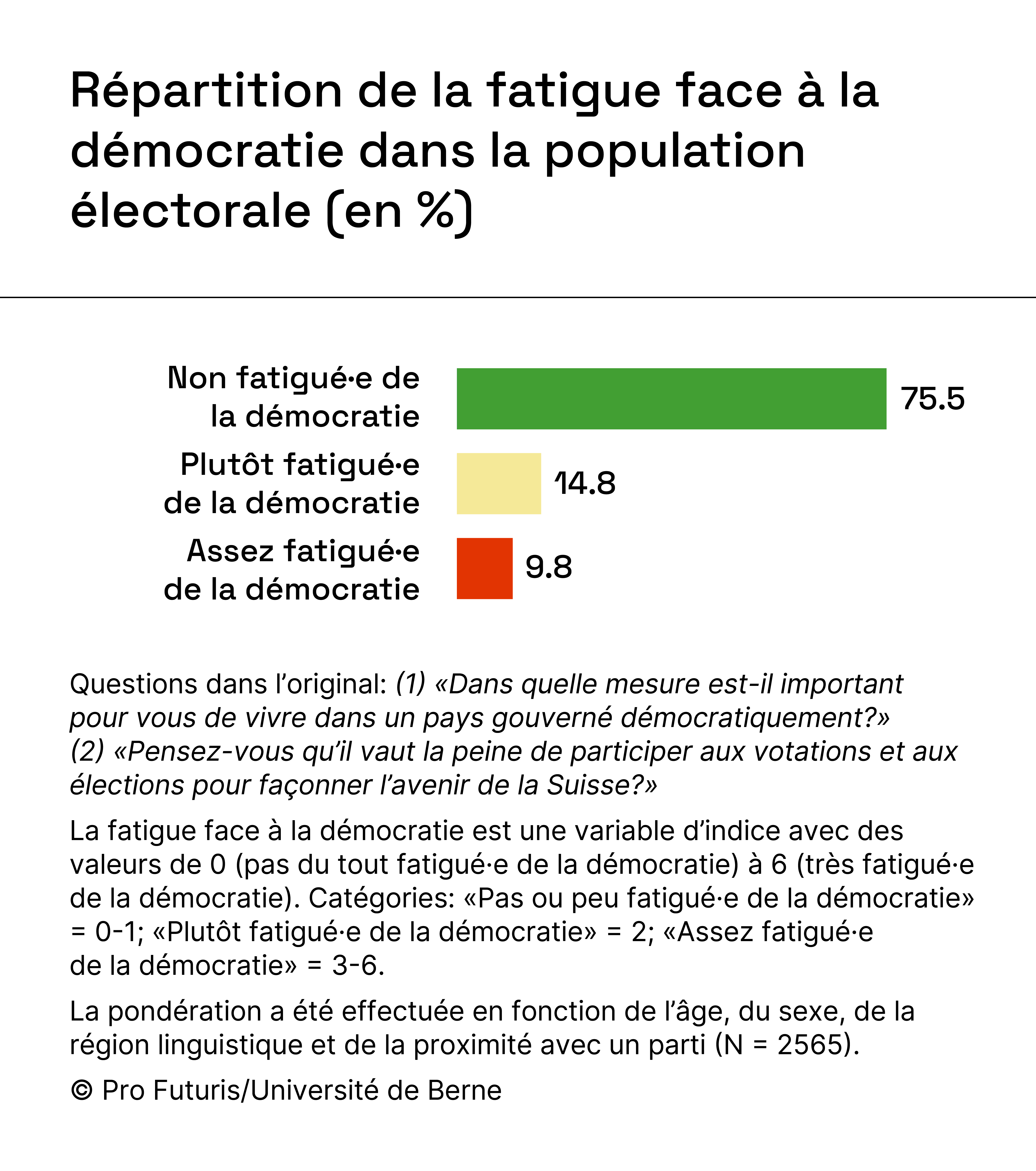 Notre étude se concentre sur deux variables: la fatigue face à la démocratie et la passivité politique. La fatigue face à la démocratie indique dans quelle mesure une personne considère qu’il est important de vivre dans une démocratie et si elle trouve qu’il vaut la peine de participer aux élections et aux votations. Le degré de fatigue face à la démocratie reflète l’attitude qu’une personne adopte vis-à-vis de la démocratie. La passivité politique indique dans quelle mesure une personne s’abstient de voter et de participer à des activités politiques. Le degré de passivité politique mesure le comportement politique d’une personne.